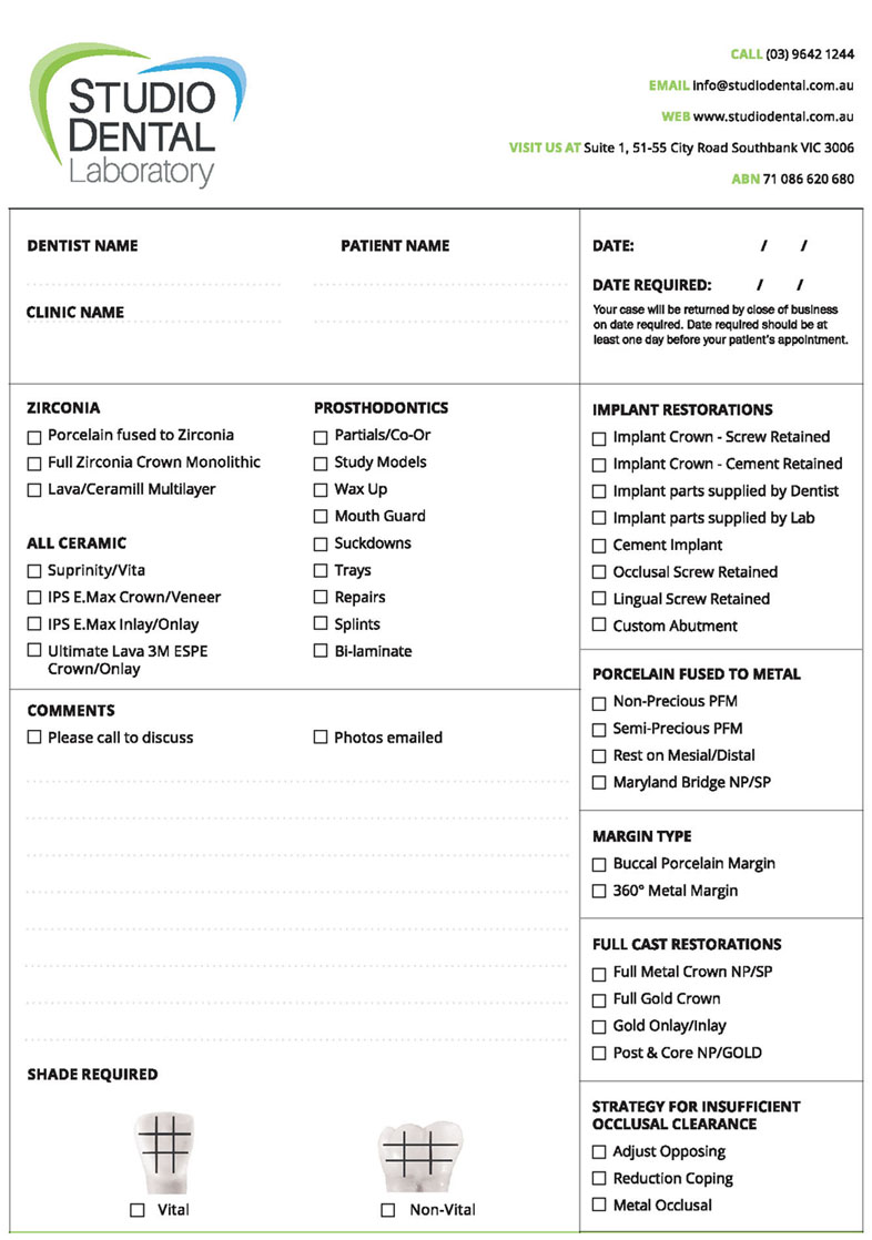 Click the image to download and fill out Studio Dental Laboratory lab sheets. Call us on (03) 9642 1244 to send in your next case.